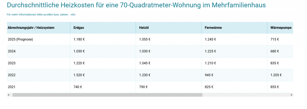 Aufgrund der höheren Energiepreise und des kalten Winters zu Jahresbeginn rechnen die Expert*innen von co2online mit einer Preissteigerung von bis zu 20 Prozent. Am deutlichsten steigen die Preise für Gas (+15 %) und Holzpellets (+20 %). Die Kostensteigerungen für Wärmepumpen (+5 %), Heizöl (+3 %) und Fernwärme (+2 %) fallen hingegen geringer aus. Für eine durchschnittliche 70-Quadratmeter-Wohnung bedeutet dies konkret: