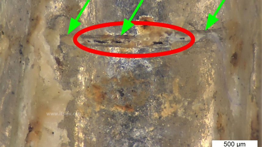In einem „Wellental“ befindet sich ein feiner Riss (rote Markierung) direkt in einer der beiden Längsriefen (grüne Pfeile). Foto: https://www.ifs-ev.org/