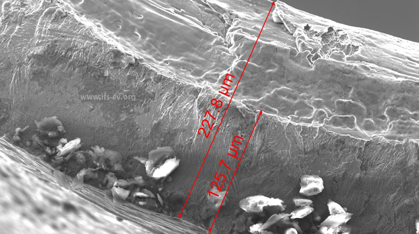 Unter dem Rasterelektronenmikroskop zeigt sich die Reduzierung der Wandstärke durch die Längsriefe um fast die Hälfte. Foto: https://www.ifs-ev.org/