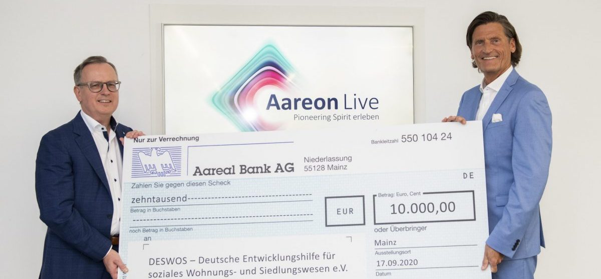 Dr. Manfred Alflen, Vorstandsvorsitzender der Aareon AG und Mitglied des Verwaltungsrats der DESWOS, übergab den Spendenscheck im Rahmen der ersten Aareon-Online-Veranstaltung Aareon Live an Gerhard Müller, Generalsekretär der DESWOS.
