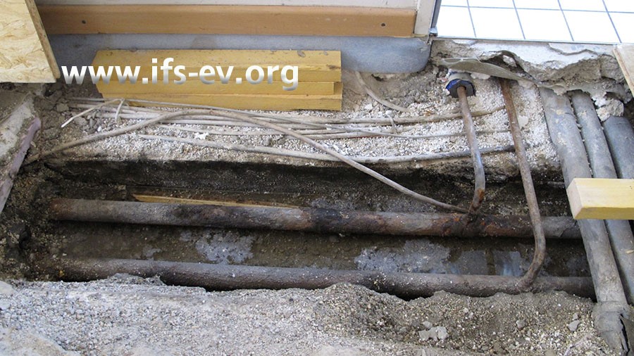 Zehn Jahre später steigt Feuchtigkeit an den Wänden im Erdgeschoss auf. Wie sich herausstellt, steht in den Bodenkanälen zentimeterhoch Wasser. Die gedämmten Heizungsrohre, die dort in einer Perlite Schüttung liegen, sind korrodiert und an mehreren Stellen durchbrochen.