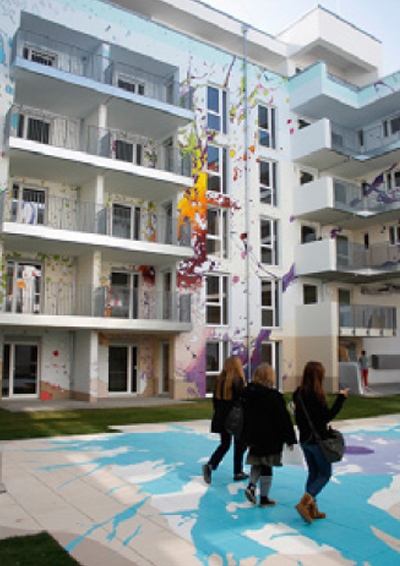 Es sieht aus, als wären hier gerade riesige Farbbeutel explodiert: Die Bodenplatten im Innenhof des neuen Studentenwohnheims „Lab“ in Darmstadt und die zum Hof gelegenen Fassaden zieren intensiv leuchtende Farbspritzer in Übergröße. Die bunten Flecken verteilen sich zwischen Fenstern und Balkonen und verleihen der Fassade Dynamik und Lebendigkeit.