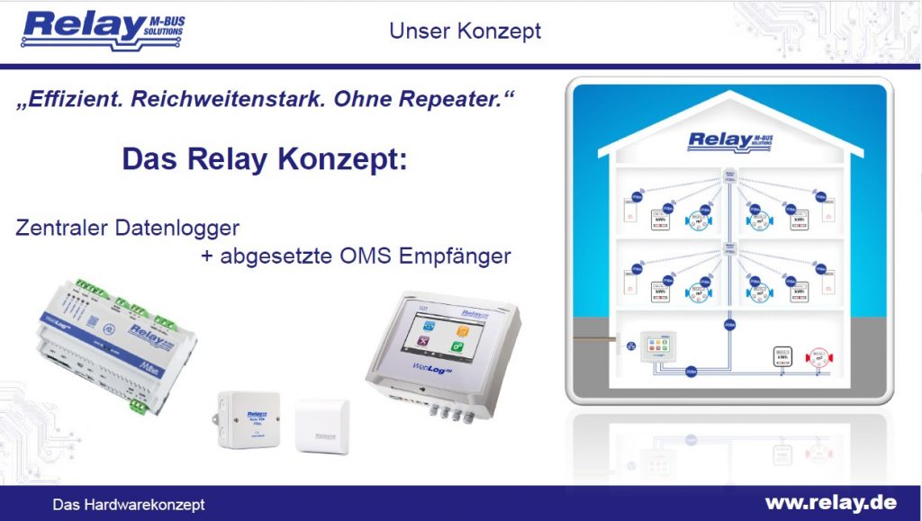 Kern des Konzepts ist ein zentraler Datenlogger, der über M-Bus mit abgesetzten OMS-Empfängern verbunden wird. In der Präsentation wird dieses Architekturprinzip mit dem Claim „Effizient. Reichweitenstark. Ohne Repeater.“ illustriert.