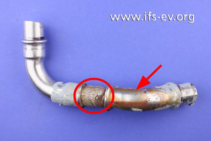 Der Abschnitt der Warmwasserleitung, in dem sich die Leckage befand, wurde zur Untersuchung ins IFS geschickt. Er bestand aus zwei Bögen und einem kurzen Rohrstück, die über Pressverbindungen miteinander verbunden waren. Schon von außen fiel auf, dass der kurze Rohrabschnitt in der Mitte korrodiert war, die Bögen hingegen nicht. Das kurze Rohrstück zwischen den beiden Bögen ist korrodiert; an dem 45°-Bogen rechts sind lediglich Ablaufspuren zu sehen (Pfeil).