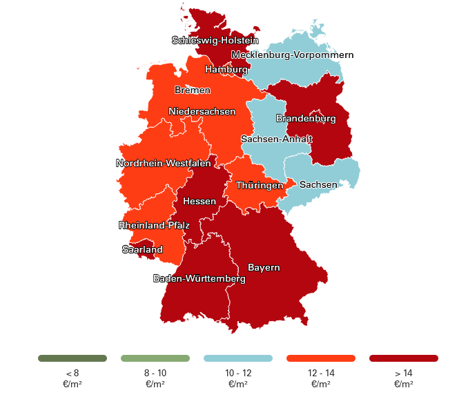 Regionale Unterschiede: Die höchsten Heizkosten pro Quadratmeter wurden 2024 in Chemnitz (19,01 €/m²), Potsdam (18,61 €/m²) und Offenbach (17,86 €/m²) gemessen. Bei den Ländern führt das Saarland (15,75 €/m²), gefolgt von Schleswig-Holstein (15,68 €/m²) und Brandenburg (14,59 €/m²). (siehe interaktive Deutschland-Karte).