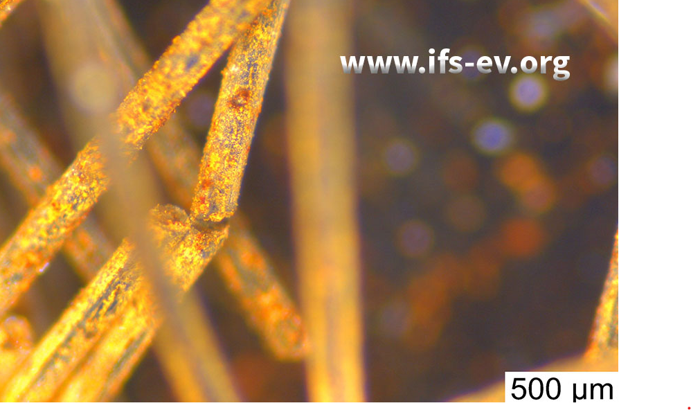 In der Vergrößerung sieht man deutlich die braunen Korrosionsablagerungen auf den Drähten. Einige davon sind durch den Korrosionsangriff gebrochen. Korrosion wird bei Edelstahl in der Regel durch Chloride verursacht. Eine Laboruntersuchung ermöglicht den Nachweis dieser Verbindungen in den Korrosionsprodukten.