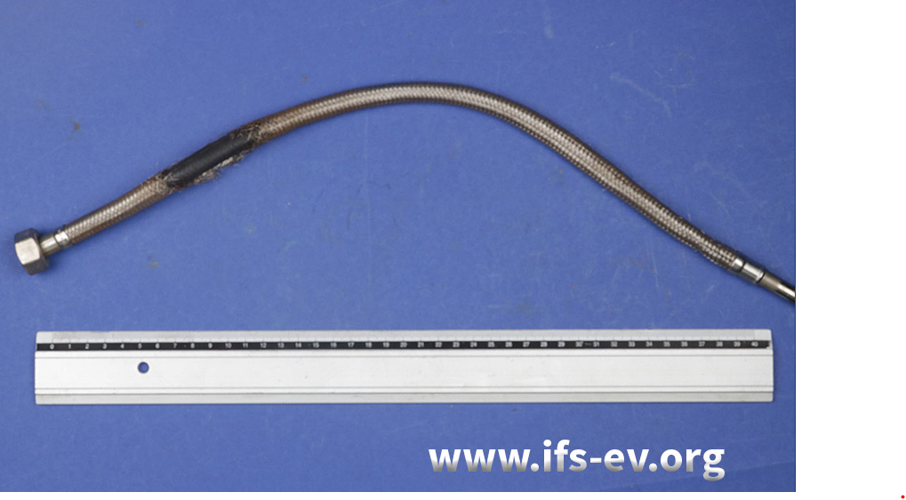 Leitungswasserschaden in einer Schule: Das Wasser lief aus einem Unterschrank, in dem ein flexibler Anschluss-Schlauch installiert war. Das IFS wurde beauftragt zu ermitteln, aus welchem Grund der Schlauch platzen konnte. Das erste Foto zeigt den Schlauch, der für eine Untersuchung ins Labor geschickt wurde. Man sieht deutlich, dass das Drahtgeflecht in einem Bereich komplett zerstört ist.