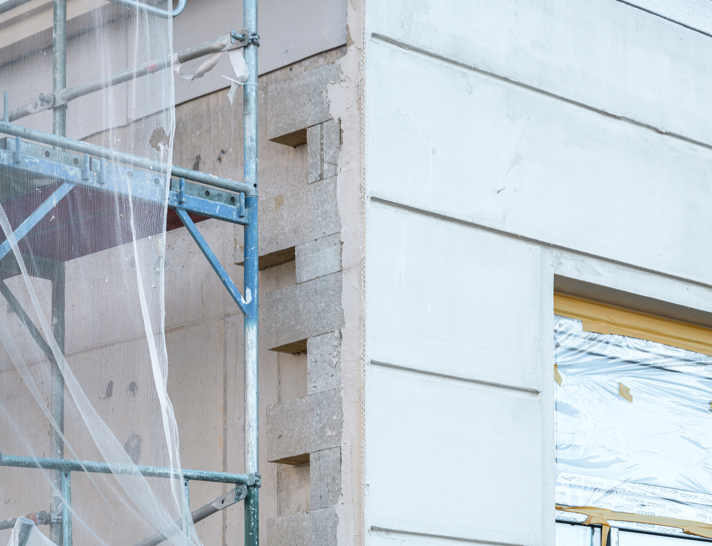 Da „Speedrock II“ Dämmplatten schnittfest sind, schufen die Stuckateure mit ihnen eine attraktive Fassadengestaltung mit Gesimsen über jedem zweiten Geschoss. Diese wurden durch einen Rückschnitt der Grunddämmplatten um einmal 40 mm und einmal 80 mm erstellt. Auf jedem Gesims liegt eine Aluminiumschale als Wetterschutz auf. Im Erdgeschoss wurden auf Außenwände aus Fertigbetonelementen Steinwolle-Dämmplatten in einer Dicke von 80 mm geklebt und verdübelt. Eine besonders ansprechende Optik entstand durch in die Dämmung gefräste Bossennuten.