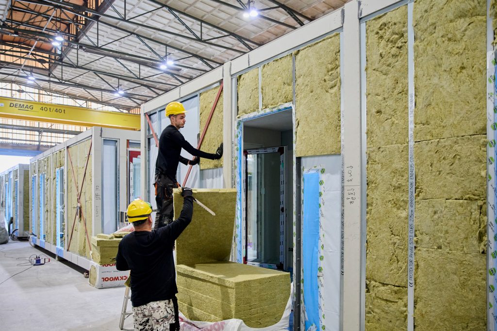 „Sonorock“, eine formstabile Dämmplatte für leichte Trennwände, sowie die Trittschalldämmung „Floorrock Acoustic CP 2“ unter der Fußbodenheizung auf den Betonbodenplatten der Module sorgen für den gesetzlich vorgeschriebenen Wärme- und Schallschutz. Da „Sonorock“ und „Floorrock Acoustic CP2“ ebenfalls aus nichtbrennbarer Steinwolle bestehen, verbessern sie zusätzlich den vorbeugenden Brandschutz.