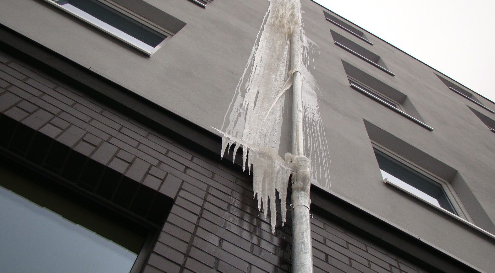 Aufstockung mit Dachterrasse. Nach einem extremen Temperatursturz, mit einigen Tagen um die minus 15 Grad, kam es unbemerkt zu einer Leckage. Die Folge: Das austretende Wasser gefror und bildete einen Eiszapfen am Fallrohr über vier Etagen hinweg.