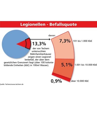 In großen Trinkwasseranlagen ist die Wahrscheinlichkeit eines zu hohen Legionellenbefalls höher. Diesen Schluss legt eine Ergebnisbewertung des Energiemanagers Techem nahe, die zeigt: Mit der Größe einer Liegenschaft steigt auch die Befallsquote. Bis zum 31. Dezember 2013 musste laut Trinkwasserverordnung in einem großen Teil der deutschen Mehrfamilienhäuser die Trinkwasserinstallation auf Legionellenbefall überprüft werden. Durch eine Kooperation mit dem akkreditierten SGS Institut Fresenius ist Techem hierfür einer der wenigen bundesweit agierenden Anbieter auf dem Markt.