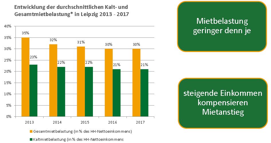 Trotz moderater Erhöhung bewegen sich sowohl die Durchschnittsmieten von 5,03 Euro/m2 (2017: 4,92 Euro/m2) als auch die Neuvertragsmieten bei Bestandsgebäuden mit 5,76 Euro/m2 (Leipzig gesamt: 6,59 Euro/m2), als auch bei Neubau und Kernsanierung mit 8,90 Euro/m2 (Leipzig gesamt: 10,00 Euro/m2) auf bezahlbarem Niveau. Der niedrige Preis für Neubauprojekte resultiert aus bereits vorhandenen Grundstücken der Wohnungsgenossenschaften. Dass Leipziger Mieten nach wie vor absolut leistbar sind, zeigen auch die Daten der Stadt Leipzig. So sank die Mietbelastungsquote der Leipziger von 35 % im Jahr 2013 auf nur noch 30 % im Jahr 2017.