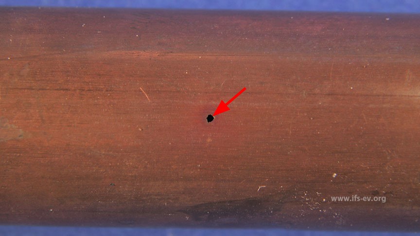Darunter war der Werkstoff durch Lochkorrosion in der gesamten Wandstärke durchkorrodiert. Die Untersuchung weiterer Rohrstücke ließ vermuten, dass die Installation des ganzen Gebäudes betroffen war.
