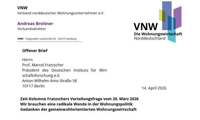 In einem offenen Brief antwortet Andreas Breitner, Direktor des Verbands norddeutscher Wohnungsunternehmen (VNW), auf die Forderungen.