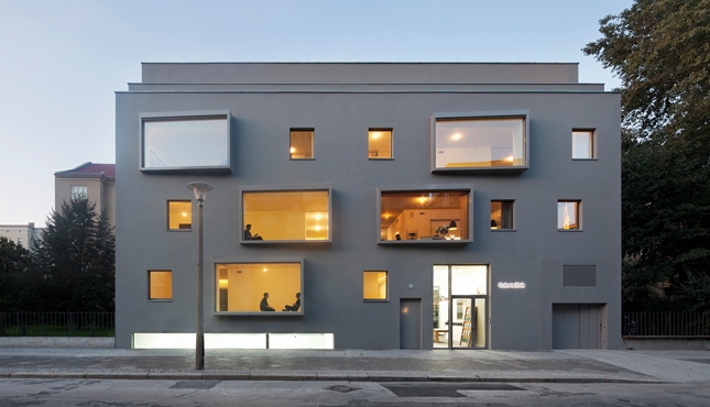 Passivhaus hinter Berlins Volksbühne mit frei auskragenden Balkon
