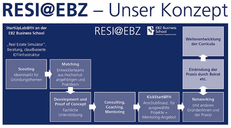 Die EBZ Business School (FH) leistet hier Unterstützung: An der Immobilienhochschule entsteht eine Gründungsförderung, die gründungswillige Studierende mit vielversprechenden Ideen fördert und mit immobilienwirtschaftlichen Unternehmen zusammenbringt. Das Bundesministerium für Forschung und Bildung fördert RESI@EBZ im Rahmen des Programms „Forschung an Fachhochschulen“ mit der Maßnahme „StartUpLab@FH“ über eine Laufzeit von vier Jahren mit insgesamt 1,2 Millionen Euro.