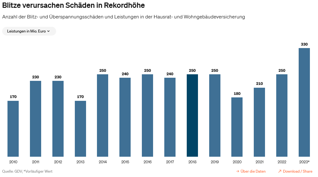Die Entschädigungsleistungen der Hausrat- und Wohngebäudeversicherungen für Blitzschäden haben den höchsten Stand seit 20 Jahren erreicht. Insgesamt wurden rund 330 Millionen Euro für etwa 220.000 Blitz- und Überspannungsschäden geleistet. Im Vergleich zum Vorjahr stieg die Schadensumme um 80 Millionen Euro, während die Anzahl der Schäden um 50.000 zunahm. Der Schadendurchschnitt von 1.460 Euro stellt den höchsten Wert seit Beginn der Erhebungen im Jahr 1988 dar; 2022 lag dieser Wert noch bei 1.420 Euro.