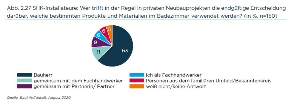 Im Neubau haben die Fachhandwerker beziehungsweise die Architekten als Informationsbeschaffer der Bauherren beim Thema Bad eine stärkere Position. Dennoch beziehen die Bauherren laut Erfahrung der von BauInfoConsult telefonisch dazu befragten SHK-Installateure sehr häufig die Informationen selbstständig, zum Beispiel aus Googlesuchen…