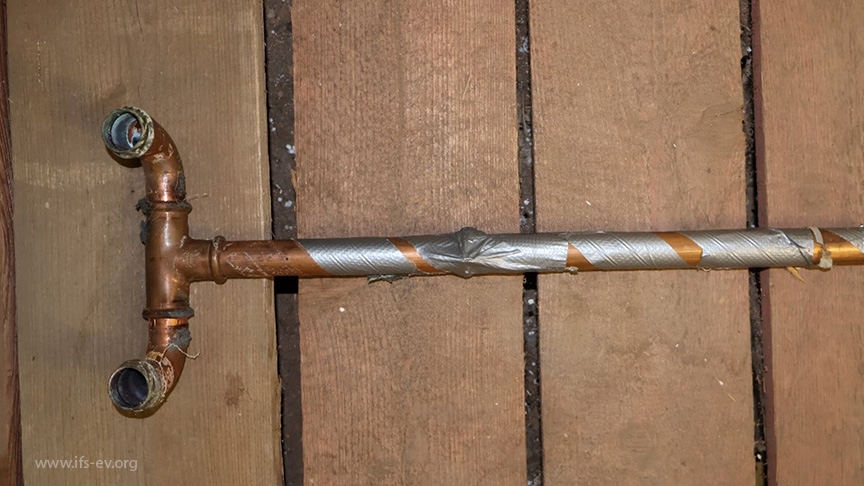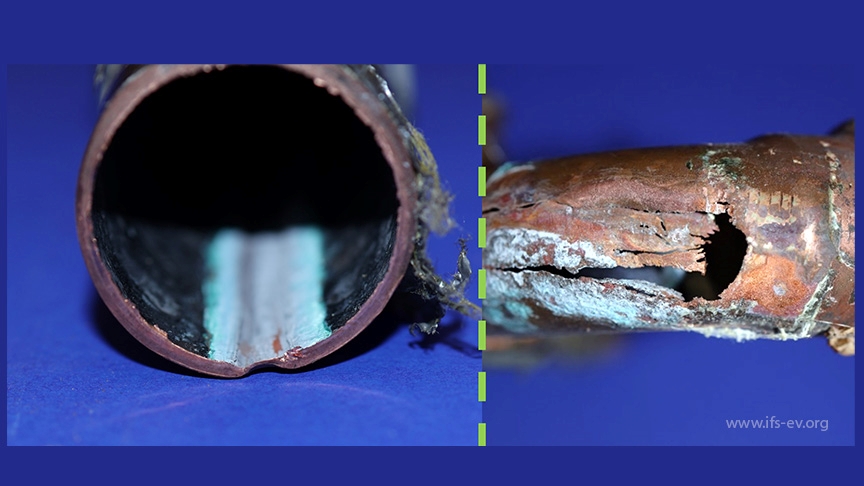 Der Rohrleitungsabschnitt aus Kupfer befand sich noch vor Ort und wurde für weitere Untersuchungen im Labor mitgenommen: An einem 90°-Bogen gab es einen massiven Rohrdurchbruch. Die Wandstärke war in diesem Bereich stark verringert.