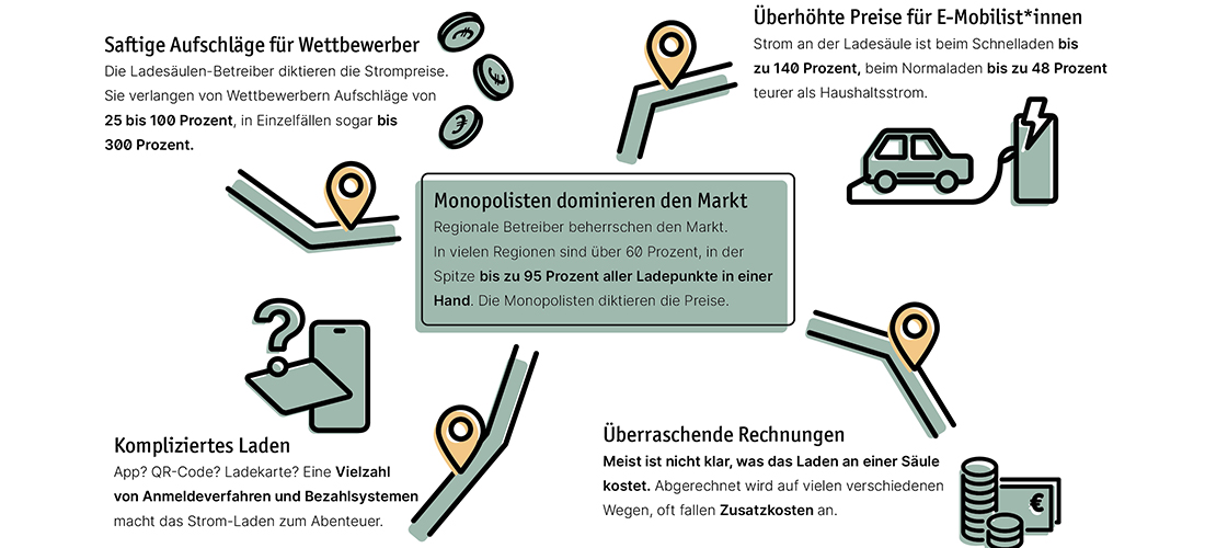 Ein Fortschritt gegenüber früheren Untersuchungen: Mittlerweile rechnen alle Betreiber per Kilowattstunde ab. Zeittarife gibt es nicht mehr. Allerdings ist der Zugang zu den Ladesäulen weiterhin nicht verbraucher* innenfreundlich. Auch sind die Kosten meist intransparent, häufig fallen Zusatzgebühren an – zum Beispiel für längere Aufenthalte am Ladepunkt…