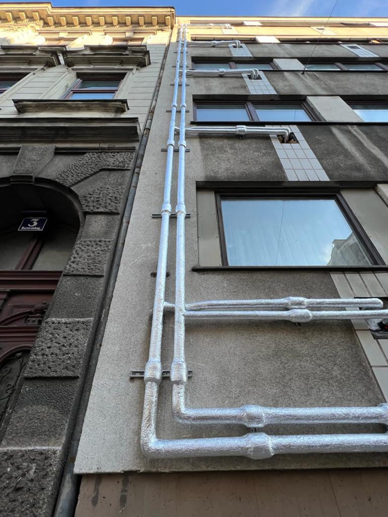 Vorzeigebeispiel Nummer eins finden wir in der Barawitzkagasse, die liegt zwar im feinen Wiener Bezirk Döbling, ist aber eine verkehrsbelastete Durch zugsstraße mit wenig Aufenthaltsqualität. Vom Aschenputtel zur Energieprinzessin der Gasse mausert sich dort gerade das 1966 fertiggestellte Wohnhaus von Harry Glück. Deren Heizsystem wird von dezentralen Einzelgasthermen auf ein Wärmepumpensystem – ein Mix aus Luft-Wärmepumpe am Dach und Sole-Wärmepumpe im Keller – umgestellt. Dazu wurden die Heizungsleitungen entlang der Fassade verlegt, und nun wird eine Wärmedämmung angebracht.