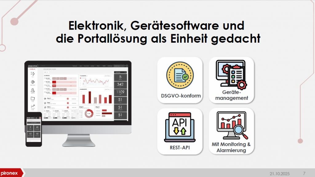 pironex versteht sich als Entwicklungsdienstleister für Elektronik und Software und betont im Vortrag, dass Hardware, Gerätesoftware und Portal von Anfang an als Einheit gedacht wurden.