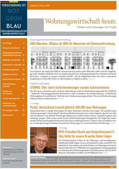 Hier können Sie alle Artikel der Januar-Ausgabe 2009 der Wohnungswirtschaft heute in einem PDF speichern und lesen. Die WOWIheute-AG4.pdf ist etwa 14MB groß. Ihr Browser könnte eine Weile brauchen um sie herunterzuladen, deshalb bitte wir Sie um etwas Geduld. Das Herunterladen erachten wir als notwendig, um Ihnen den größtmöglichen Lesespaß zu garantieren.